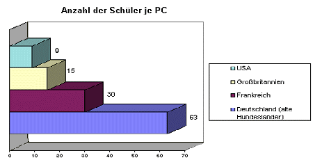 Die Förderung kommunikationstechnischer Grundbildung und die Ausbildung von Fähigkeiten zur inhaltlichen und - in einem ganzheitlichen Sinne - auch emotionalen, sozialen und psychischen Bewältigung der Informationsflut des Internet, muß im Bildungswesen mehr Gewicht erhalten. In anderen Staaten wurde der strukturelle Einfluß, den Medien auf Individuum und Gesellschaft haben, schon frühzeitig erkannt. Die Förderung von Medienkompetenz kann bereits im Elementarbereich beginnen. So übten in Japan schon 1990 in Kindertagesstätten speziell geschulte Erzieherinnen mit den Kindern fernsehen, während 1987 die deutschen Jugendminister und Senatoren (8) noch verfügten, daß Computer und Videospiele im Kindergarten [nicht] eingesetzt werden." Diese Direktive beruhte damals auf der Einschätzung, daß Kindern aufgrund ihrer kognitiven Entwicklung eine Differenzierung der erlebten Sehinhalte nicht möglich sei, und zeigt auch heute noch Wirkung. Bereits durch diesen kurzen Rückblick wird deutlich, wie sehr politische Rahmenbedingungen die konkrete Ausgestaltung medienpädagogischer Inhalte beeinflußt. Auch das 1996 gestartete Projekt Schulen ans Netz (9) ist ein Beispiel für medien- und bildungspolitische Top-Down-Implementierung. Diese, von der Bundesregierung so bezeichnete, Bildungsoffensive kann nur einen ersten zaghaften Schritt darstellen. Denn die Aus- und Fortbildung von Lehrern würde zwar flächendeckend benötigt, erfolgt bisher aber nur punktuell in Form einzelner Modellversuche. Das Konzept Orientierungsrahmen Medienerziehung in der Schule (10) der Bund-Länder-Kommission für Bildungsplanung und Forschungsförderung gibt die Verantwortung für die Ausgestaltung an die Länder weiter. Mit der Initiative Schulen ans Netz hat das BMBF, zusammen mit der Deutschen Telekom AG und dem DFN-Verein(11) (Deutsches Forschungsnetz) den beteiligten Schulen die Anschaffung von Hardware ermöglicht und Zugang zu den Netzen verschafft. Doch diese Investitionen (20 Mio. DM jährlich) stehen bislang noch in keinem Verhältnis zu den Aufwendungen für die Anbindung von Schulen im Rahmen der amerikanischen NII oder zu den Aufwendungen bei europäischen Nachbarländern.